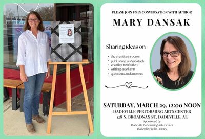 "What a wonderful experience I had last night at Auburn Oil Company Booksellers during the "In Conversation With Mary Dansak" event! It was truly a remarkable evening filled with Mary's exceptional teaching and storytelling skills. Her ability to engage and inspire the audience was on full display, making the event enjoyable and enlightening. Thank you, Mary." --Darby Womelsdorf
